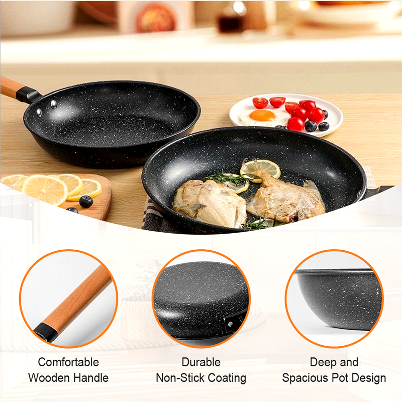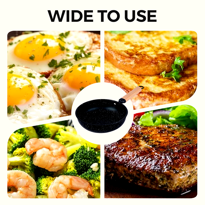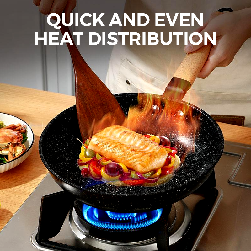 MANCHE EN BOIS CONFORTABLE : Équipée d’un manche en bois lisse, sans échardes, offrant une prise en main sûre et résistante à la chaleur. Apporte une touche rustique tout en garantissant un contrôle confortable et sécurisé lors de la cuisson.