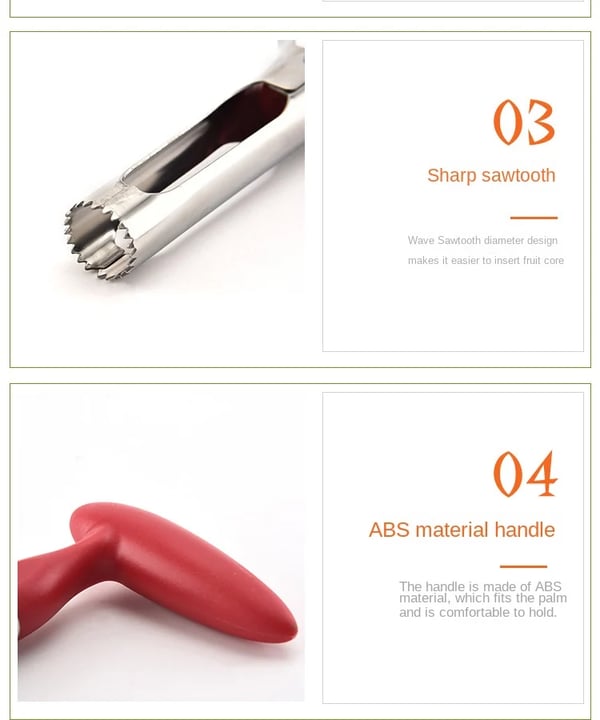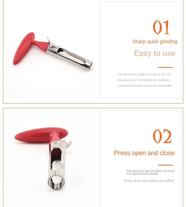 Notre découpe-pommes possède un design élégant avec deux lames à pointes dentelées tranchantes et une poignée ergonomique. Il vous aide à éliminer parfaitement le trognon d'un fruit en un seul geste simple.