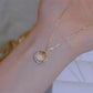 This elegant necklace features a delicate gold chain that supports a captivating pendant. The pendant consists of a circular frame adorned with sparkling accents, enclosing a beautiful shell motif that adds a touch of ocean-inspired charm. Suitable for any occasion, this necklace is more than just an accessory, it is an expression of style and elegance.